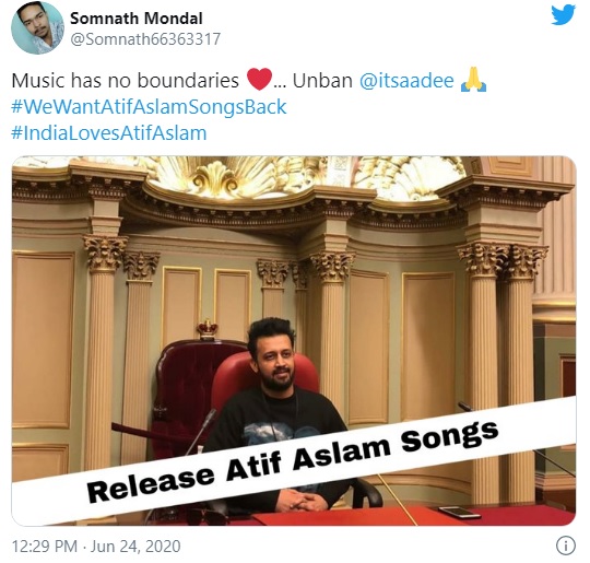 سومناتھ نے کہاکہ موسیقی کی کوئی حدود نہیں اور ساتھ ہی انہوں نے عاطف اسلم کے حق میں ہیش ٹیگ استعمال کیا کہ ہم عاطف اسلم کے گانوں کو واپس لانا چاہتے ہیں’۔