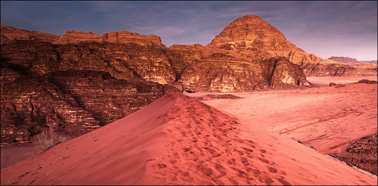 مشرق وسطیٰ کے ملک اردن میں واقع صحرا ’وادی رم‘ کو مریخی وادی بھی کہا جاتا ہے۔ سنگلاخ پہاڑوں اور اونچے اونچے پتھروں پر مشتمل یہ علاقہ مریخ کی طرح لق و دق صحرائی میدان معلوم ہوتا ہے۔