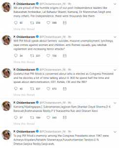 چھتیس گڑھ میں ایک انتخابی ریلی میں مودی نے کانگریس سے کہا تھا کہ وہ نہرو- گاندھی خاندان کے باہرکے کسی قابل کانگریسی کو پانچ سال کے لئے پارٹی کا صدر بنائیں۔ چدمبرم نے مسلسل ٹوئٹ کرکے صدور کے نام بتائے اورکہا کہ کانگریس کو آزادی کے بعد بابا صاحب بھیم راوامبیڈکر، لال بہادر شاستری، کے کامراج اورمنموہن سنگھ جیسے جنرل پس منظرکے لیڈروں اورآزادی سے پہلے کئی دیگرہزاروں لیڈروں پرفخرہے۔